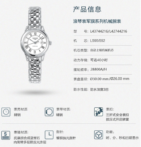 商品名称:Longines浪琴 正品军旗系列女士机械表瑞士手表女腕表
